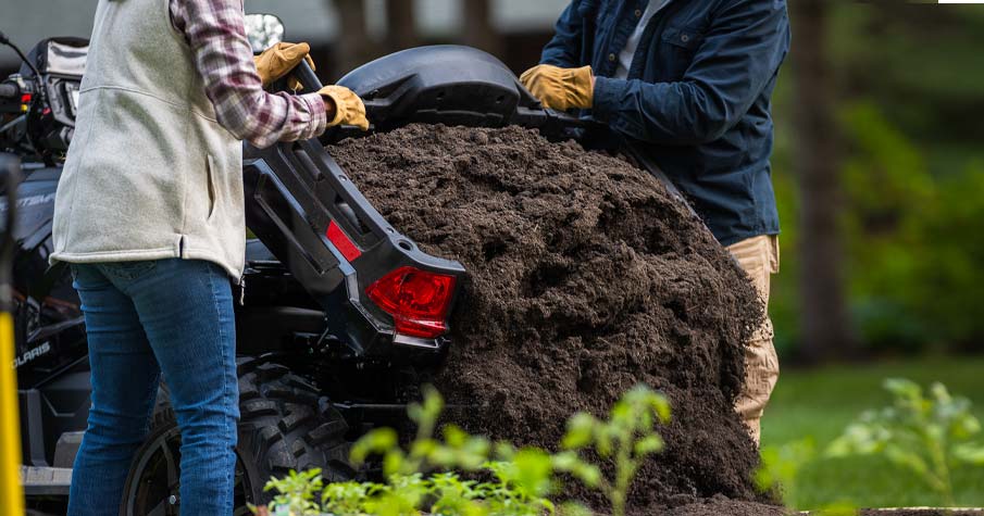 - 5 gal (18.9 L) front dry storage, Lock & Ride dump box rails & rear racks, tie-down rails in dump box