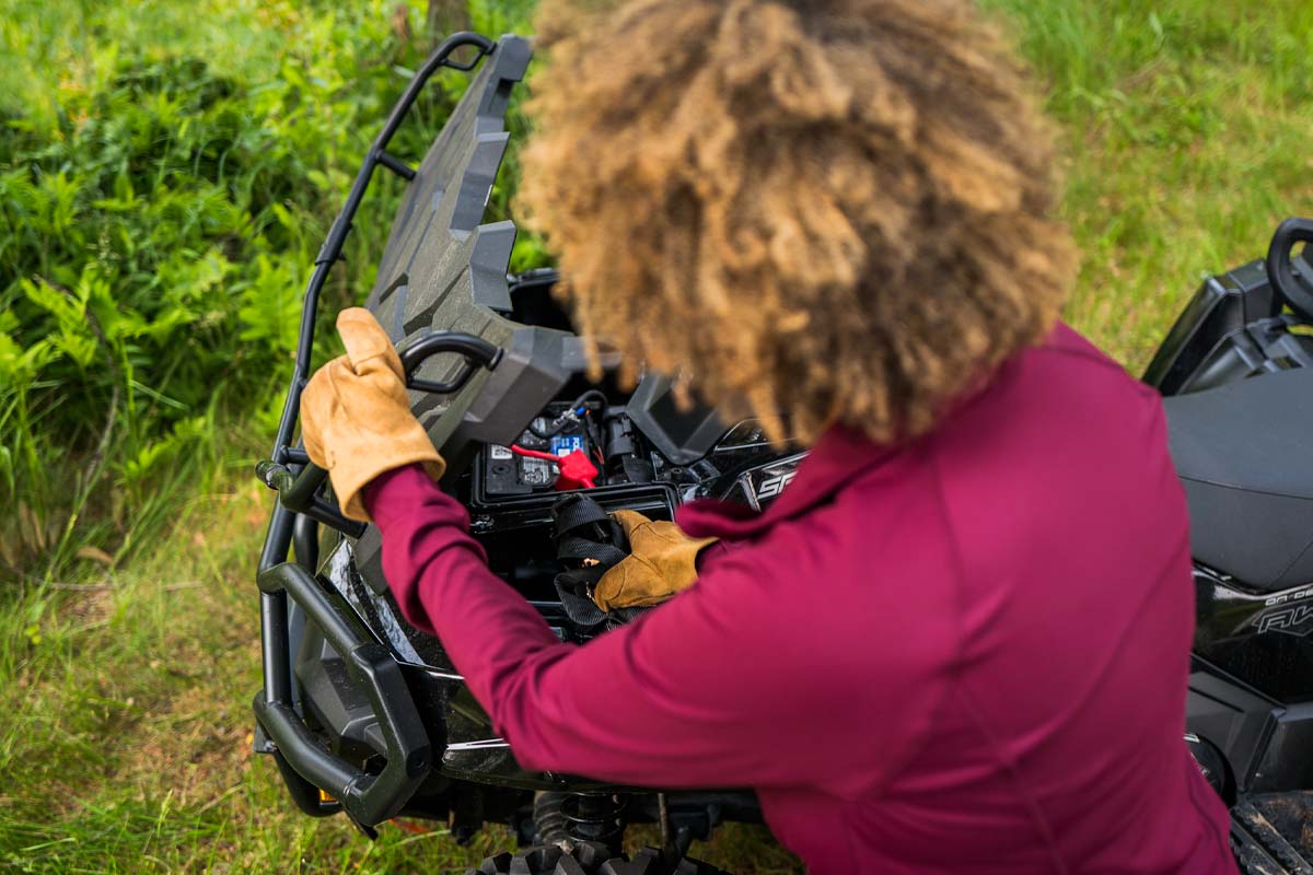 - 12-volt power plug, in-pod trickle charging port, pre-wired for hand and thumb warmers, PIN-activated security system (P.A.S.S.), Front rack extender, bed box, front and rear A-arm guards