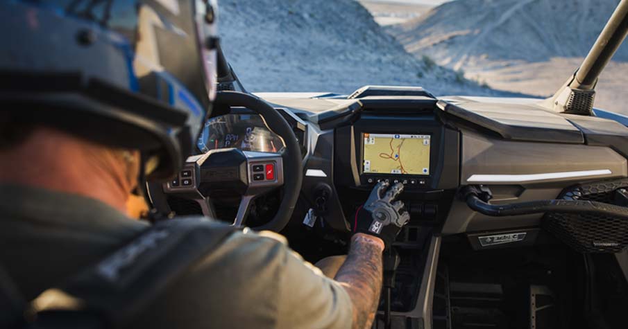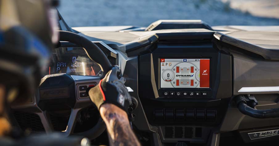 - RIDE COMMAND® 7” Glove-Touch Display: DYNAMIX 2.0 Visualizer, Built-In GPS, , Topographic Mapping, Bluetooth & USB Smartphone Connectivity, AM/FM & Weather Radio, In-Vehicle Communications Capable With Optional Sena Headsets, Polaris P.A.S.S Anti-Theft System. Dual-sweep Analog Dials w/ 4" LCD Rider Information Center: User Selectable Blue/Red Backlighting & Brightness, Programmable Service Intervals. Digital Instrumentation: Speedometer, Tachometer, Odometer, Tripmeter, Clock, Hour Meter, Gear Indicator, Fuel Gauge, Coolant Temperature, Voltmeter, Service Indicator and Codes, Seat Belt Reminder Light, Gear Indicator, DC Outlet.